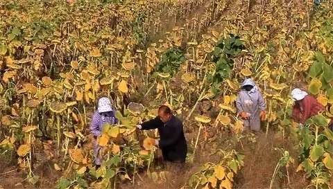 向日葵適時收獲非常關鍵。收獲過早會影響飽滿度,過晚食葵會發(fā)生落粒,油葵會遭受鳥害、鼠害。從植株的外部形態(tài)來看,葵盤背面和莖稈變黃,子粒變硬(含水率30%左右),大部分葉片枯黃脫落,托葉變成褐色,舌狀花已脫落,這是收獲的適宜時期。收獲時期適宜既減少晾曬的時間,又可提高子實的飽滿度,從而達到增產(chǎn)增收的目的。目前收獲向日葵多數(shù)還是手工操作,人工將植株割倒,然后割盤,或者直接站稈割盤,葵盤收回后可用脫粒機脫粒,或人工用木棍擊打脫粒,脫粒后必須及時晾曬,防止堆積發(fā)熱變質(zhì)。